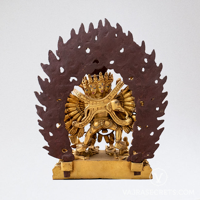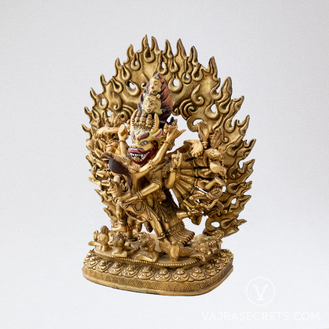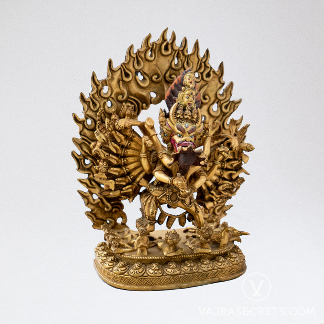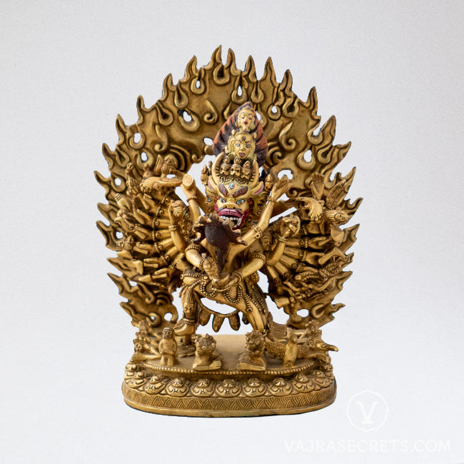 A hand-carved copper statue of Tantric Buddha Yamantaka, completed with hand-painted gold faces and ferocious deity features. Buddha Yamantaka is the ferocious aspect of Wisdom Buddha Manjushri, whose profound practice utilises anger as a means to destroy delusions, and has the potential to purify tremendous amounts of negative karma, protect from harmful entities, and offers a swift method to achieve higher attainments. Suitable for anyone engaging in his practice and for those aspiring to advance to highest yoga tantra practices and an excellent focal point and meditation aid for daily practice.