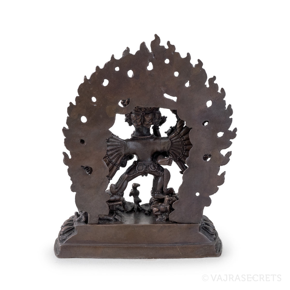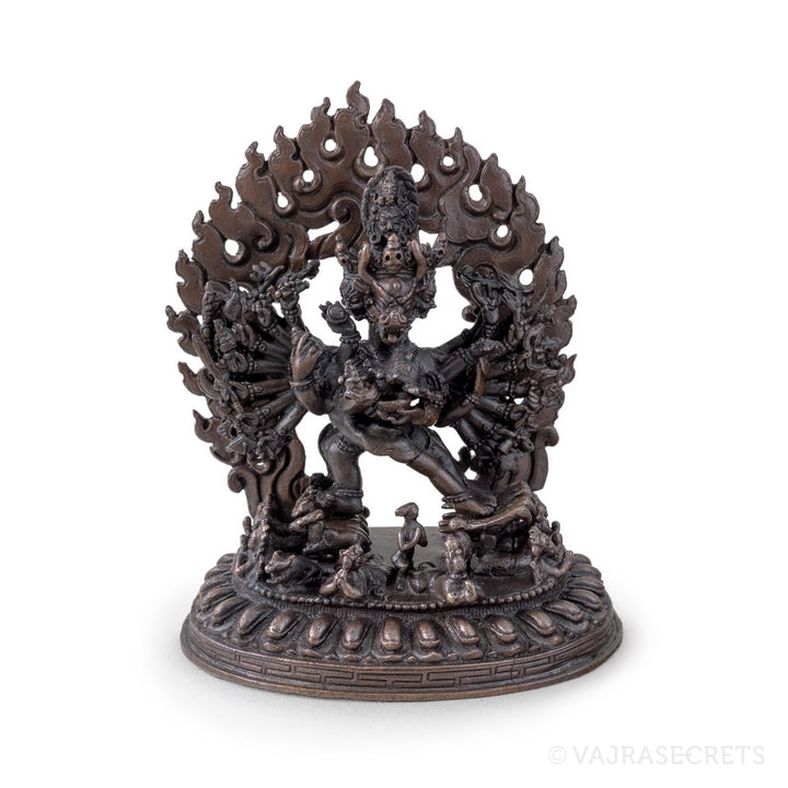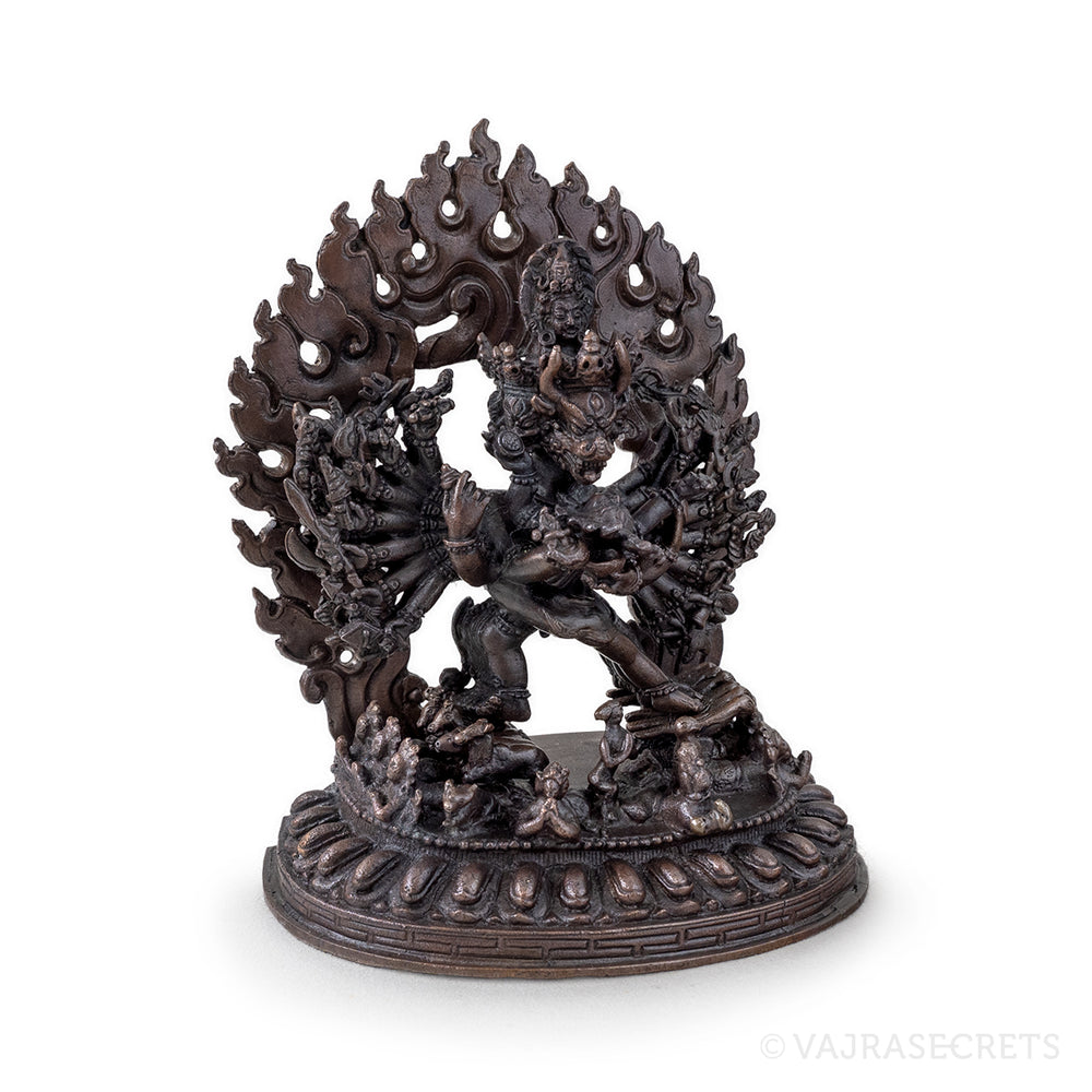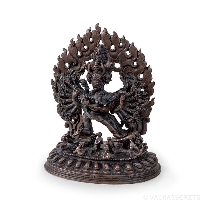A handcrafted copper statue of Tantric Buddha Yamantaka, the ferocious aspect of Wisdom Buddha Manjushri who can purify tremendous negative karma and protect from harmful entities. His profound practice utilises anger as a means to destroy delusions and offers a swift method to achieve higher attainments. Suitable for anyone engaging in his practice and for those aspiring to advance to highest yoga tantra practices.